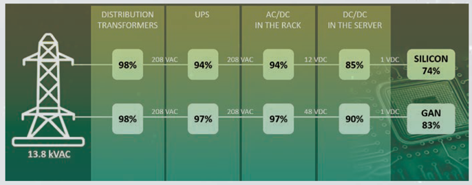For a typical major Tier One Data Centre Operator assuming 6 smaller and efficient GaN-based power supplies can perform the work of 10 Si-based units.