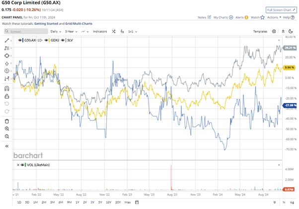 Trying to keep things simple I have charted the G50 Corp share price against the Van Eck Junior Gold Miners ETF (GDXJ) and the iShares Silver Trust (SLV). YTD all 3 are tracking almost perfectly.