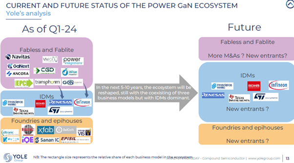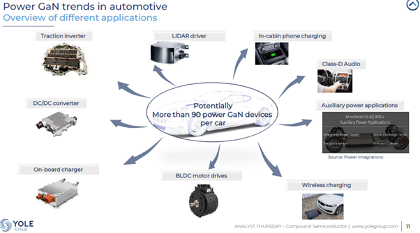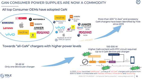 Last week Yole hosted a webinar: Unveiling the future: the megatrends shaping the compound semiconductor industry. There was a huge focus on gallium nitride and gallium arsenide. Below we include only a handful of the 50+ slide presentation with a focus on the Power GaN market. The growth rates and brand names associated with these markets surprised us the most. There was a significant discussion on GaN and its outlook for use in the Telecom infrastructure market and Photonics which we do not include below. We suggest you head to their website as a great resource for understanding the compound semiconductor industry.